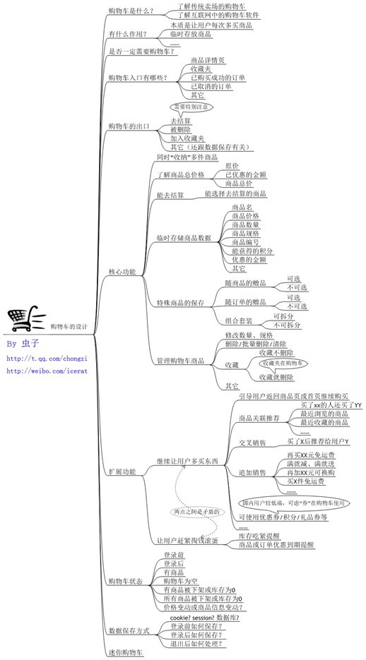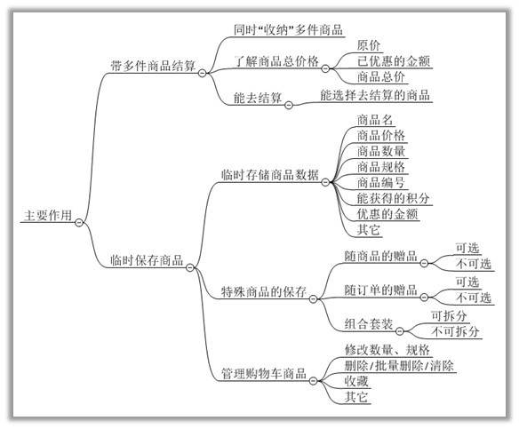 见下图,由用户需求推导出购物车核心功能需求。下图是一个购物车应该满足的功能需求,当然,根据自身网站情况可增减。