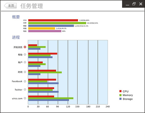 最后一个值得一提的特性是重新设计的任务管理器。本来不想加这个东西的,对普通用户太专业了。不过想想最先使用这个概念浏览器的用户应该有不少是懂计算机的geek或代码狂人,索性就顺便设计一下好了,通过简单的图表可视化辅以数据展示,看有哪一行太长了就打叉关掉,我想应该geek们都看得懂是啥意思吧。
